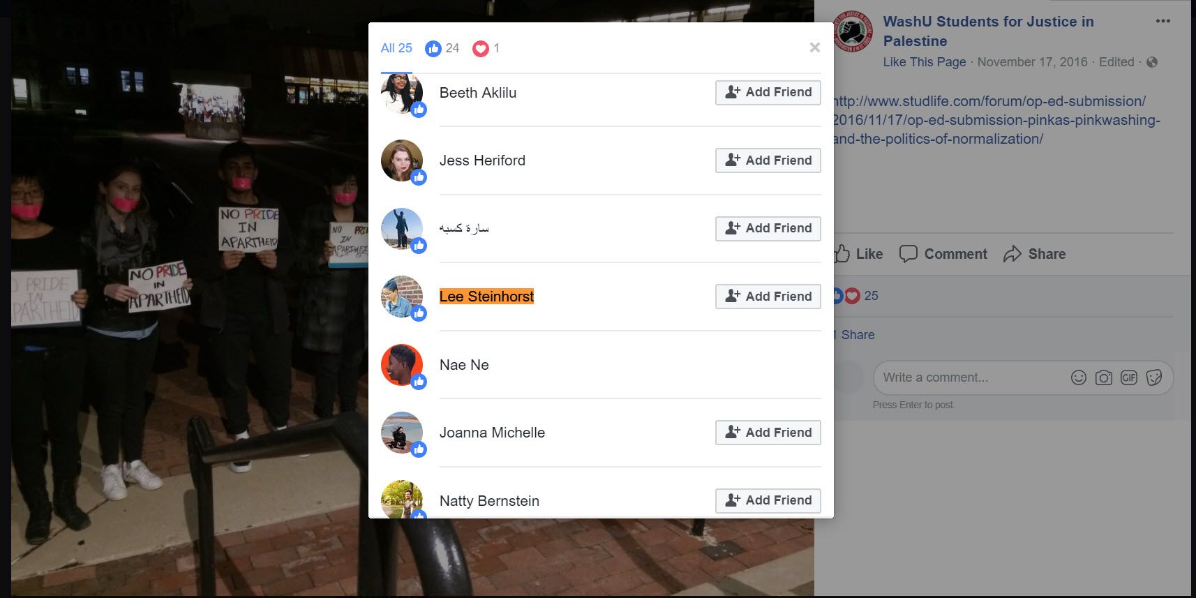 Steinhorst is also a member of the WashU Palestine Education Network (WUPEN) Facebook group since December 2016.