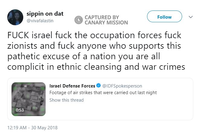 On May 30, 2018, Dweik tweeted: “F**K israel f**k the occupation forces f**k zionists and f**k anyone who supports this pathetic excuse of a nation you are all complicit in ethnic cleansing and war crimes.”