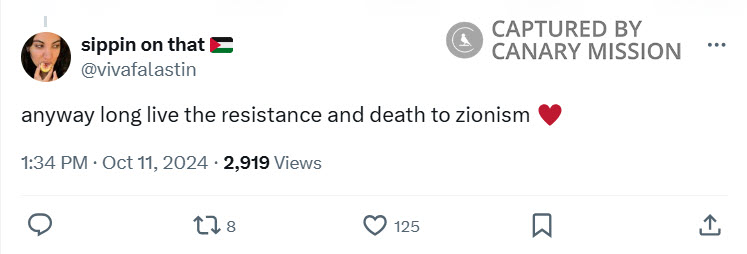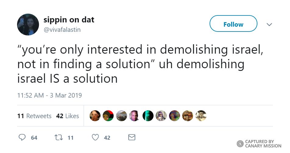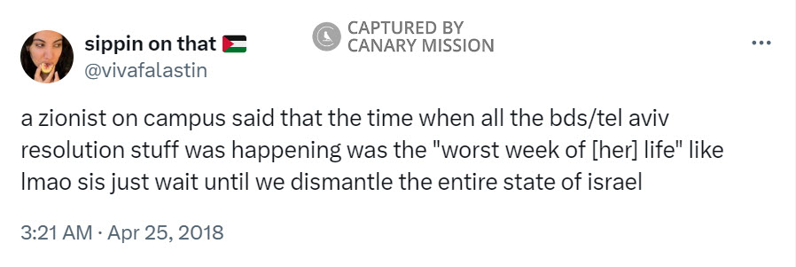 On April 24, 2018, Dweik tweeted: “a zionist on campus said that the time when all the bds/tel aviv resolution stuff was happening was the ‘worst week of [her] life’ like lmao sis just wait until we dismantle the entire state of israel.”