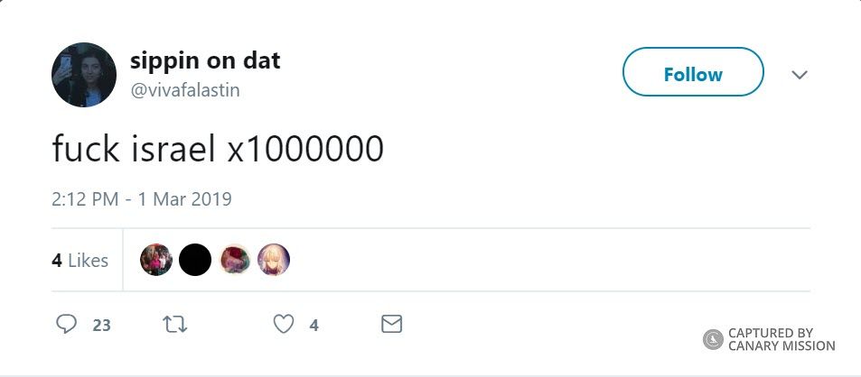 On March 1, 2019, Dweik tweeted: “f**k israel x1000000.”