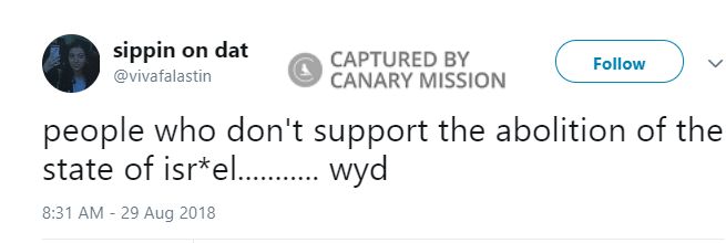 On August 29, 2018, Dweik tweeted: “people who don't support the abolition of the state of isr*el........... wyd [what you doing].”