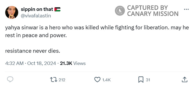 On October 18, 2024, Dweik posted on X: “yahya sinwar is a hero who was killed while fighting for liberation. may he rest in peace and power. resistance never dies.”