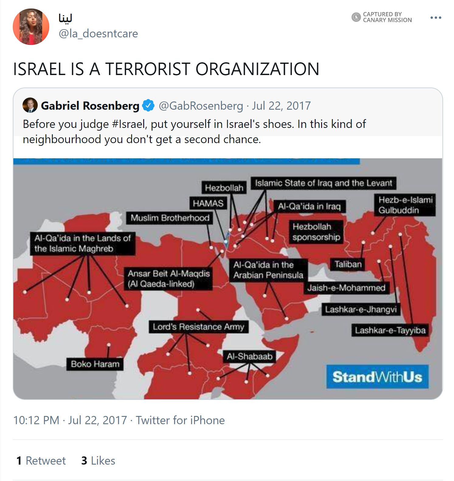 On July 22, 2017, Almasri tweeted: “ISRAEL IS A TERRORIST ORGANIZATION.”