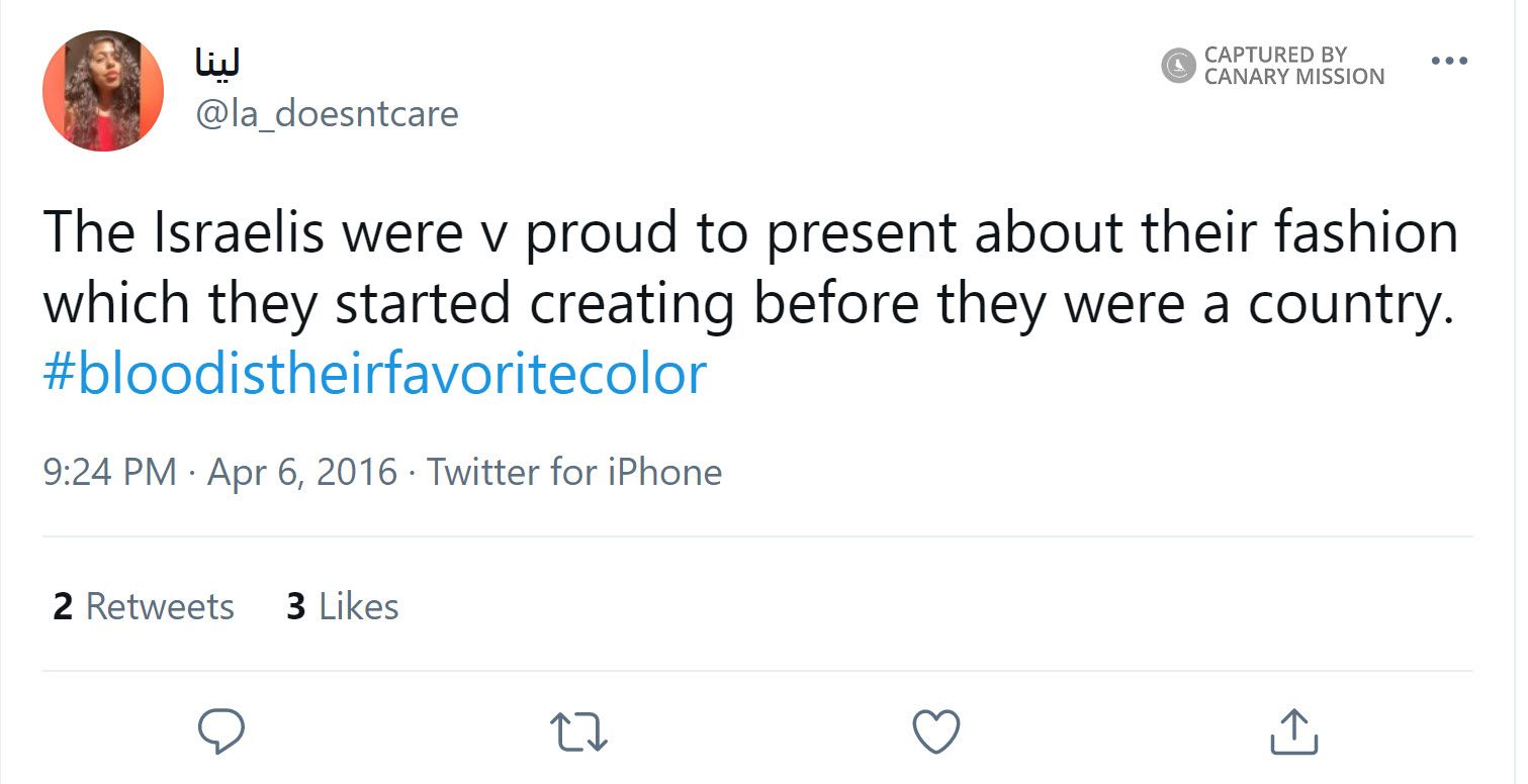 On April 6, 2016, Almasri tweeted: “The Israelis were v proud to present about their fashion which they started creating before they were a country. #bloodistheirfavoritecolor.”