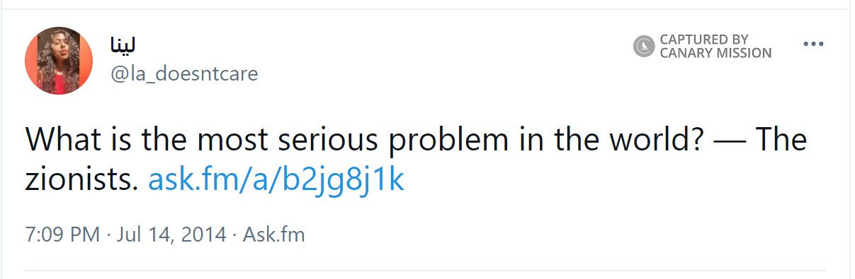 On July 14, 2014, Almasri tweeted: “What is the most serious problem in the world? — The zionists.”