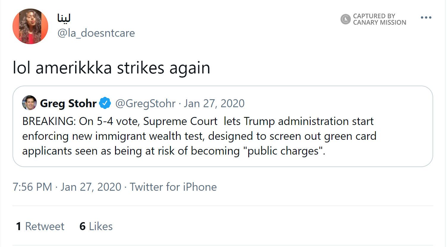 On January 27, 2020, Almasri tweeted: “lol amerikkka strikes again.”The term “Amerikkka” uses the initials of the Ku Klux Klan (KKK) as a way to demonize America as “fascist or racist.”