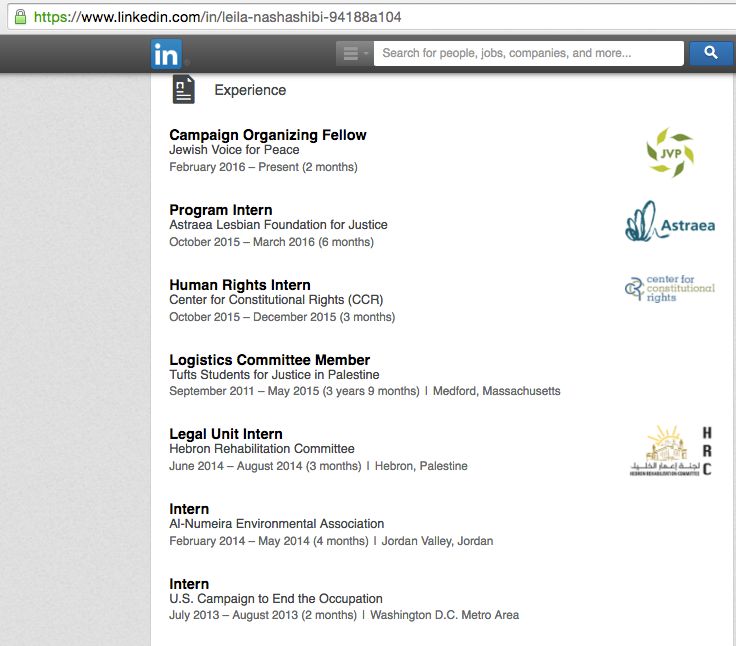Nashashibi’s LinkedIn page also said she was a 2013 summer intern at the U.S. Campaign to End the Israeli Occupation, now known as the U.S. Campaign for Palestinian Rights (USCPR).