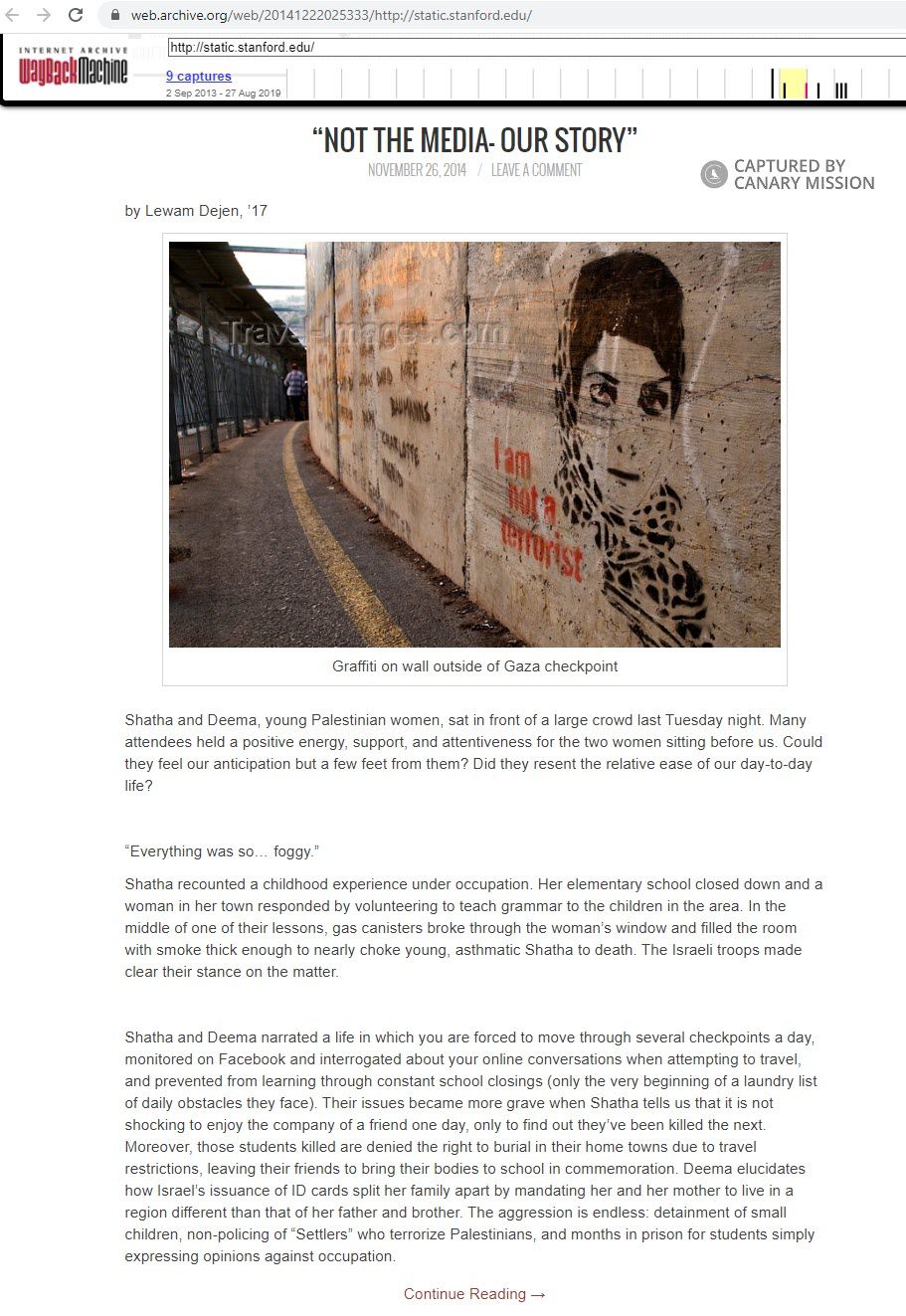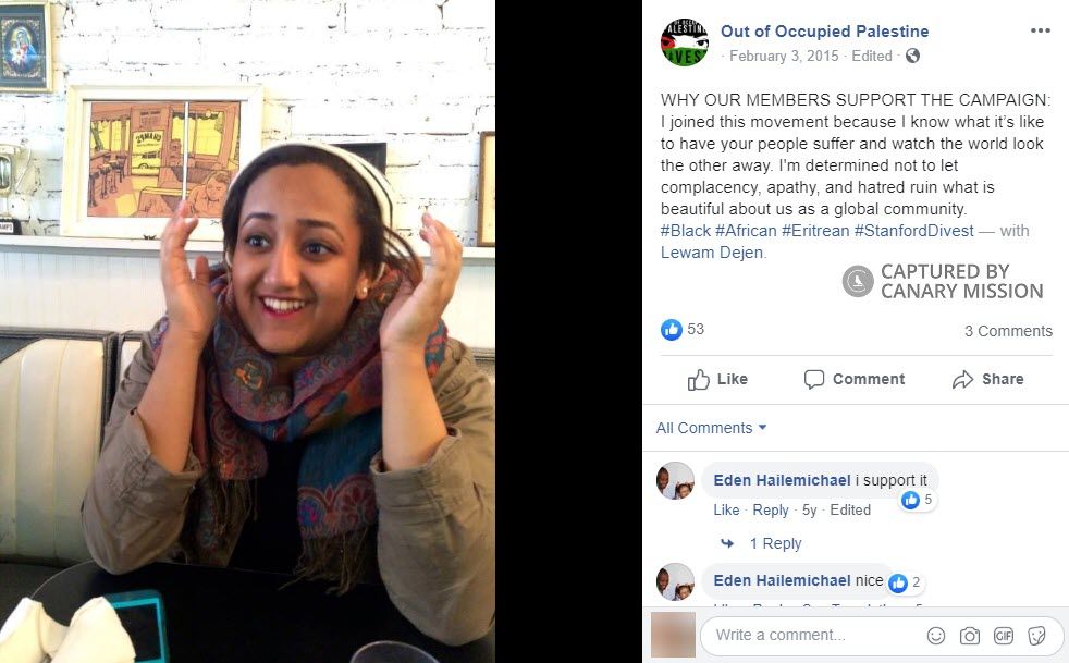 On November 26, 2014, Dejen wrote an article for the online Stanford publication, STATIC, summarizing the visit of two students from Birzeit University who spoke at a “Right to Education” event, hosted by Stanford SJP and promoted by SOOP.The Right to Education Tour brings Birzeit University students to U.S. campuses, where they claim that Israel is obstructing the rights of Palestinians to higher education. This claim mischaracterizes the sweeps Israeli security forces have made to shut down terror cells operating on the Birzeit campus, including cells linked to Hamas.