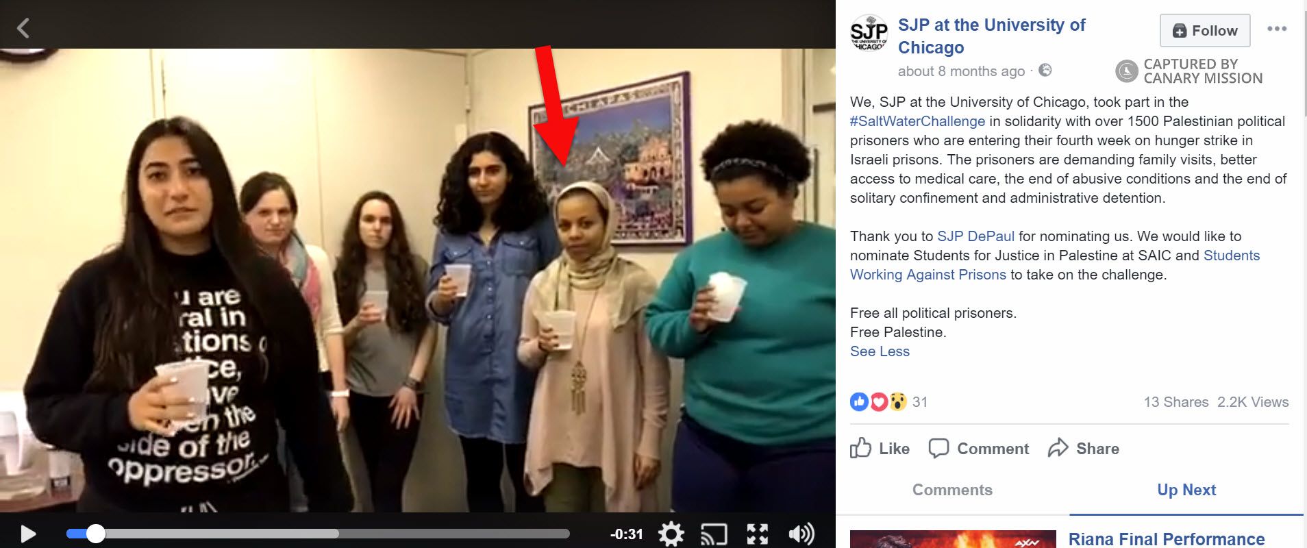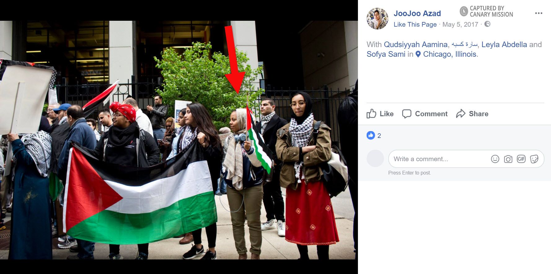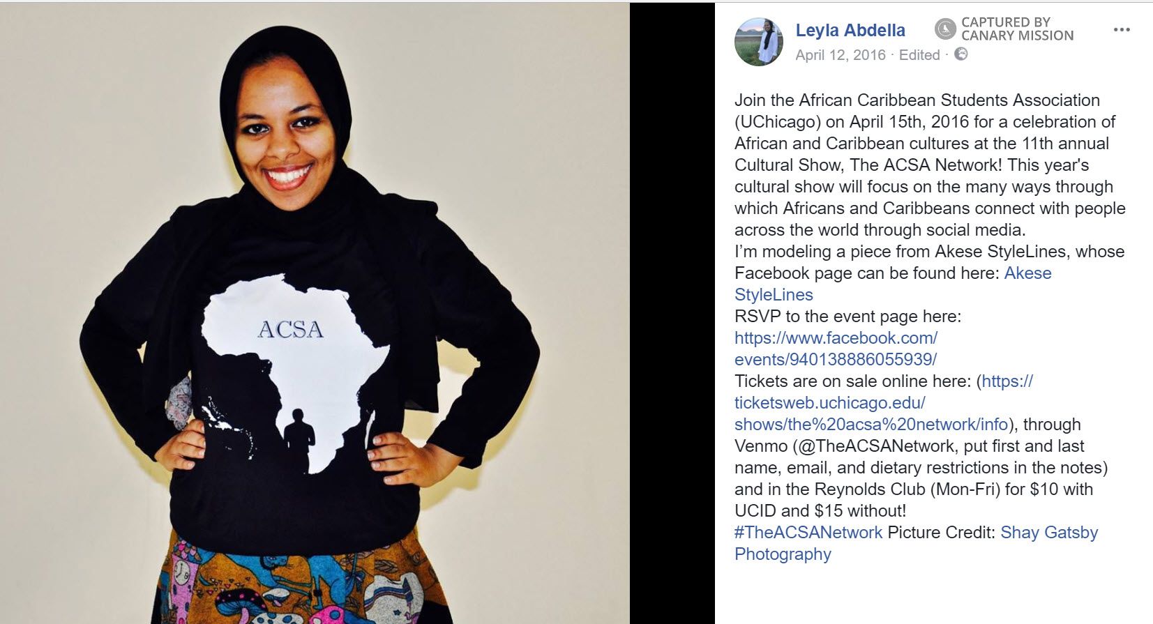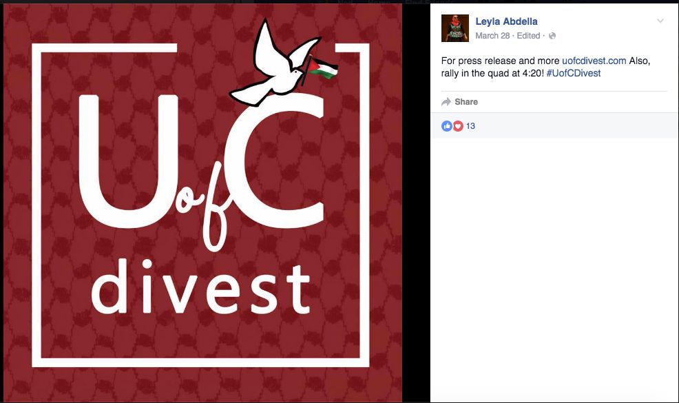 On April 12, 2017, Abdella again changed her Facebook profile photo to the UofC Divest campaign poster and wrote: “#TellTheTrustees to honor our resolution by divesting from Israeli apartheid and creating a Socially Responsible Investment Committee.”