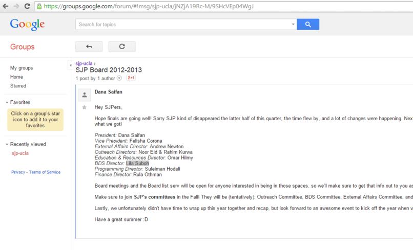 Lilah Suboh was the Boycott Divestment Sanctions (BDS) Director for Students for Justice in Palestine (SJP) at the University of California Los Angeles UCLA for the 2012-2013 academic year. Suboh is currently a member of SJP at New York University (NYU).