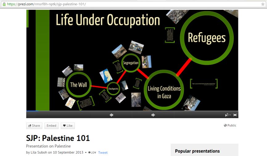 During her time at UCLA she produced an educational online presentation for SJP entitled "Palestine 101." The presentation delineates a pro-Palestinian version of the history of the State of Israel, describes "life under occupation" and ends with a description of the BDS movement and calls on students to divest.
