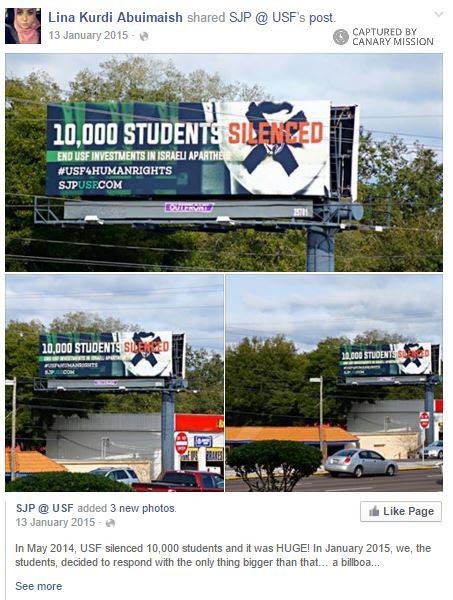 On January 13, 2015, Abuimaish shared an SJP USF Facebook post that promoted the group’s BDS campaign.