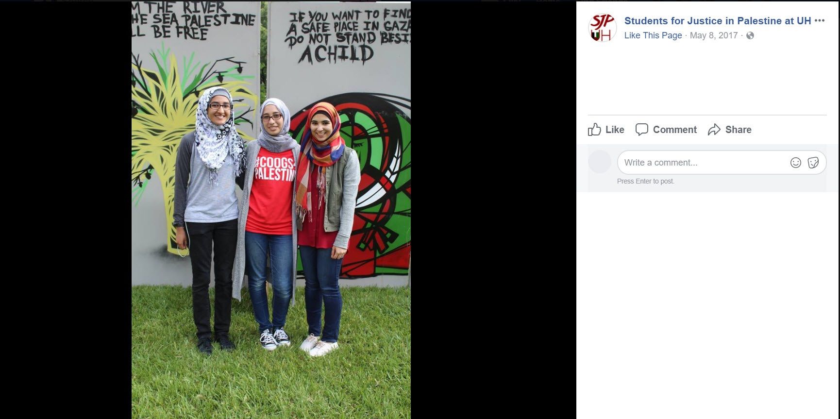 On October 1, 2017, SJP UH shared a Facebook post that read: “17 years ago today, 12yr old Muhammad Al-Durra was shot dead on LIVE TV in his father's arms.#Coogs4Palestine #FreePalestine.”