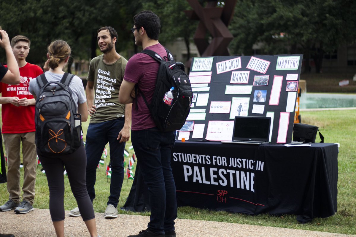 On September 7, 2018, SJP UH tweeted: “Each flag at last week’s tabling event honored one of the 195 martyrs that had fallen while fighting at the forefront of the Great Return March. We carry the martyrs with us each and every day as we revive their commitment to the Palestinian cause. #FlashbackFriday”