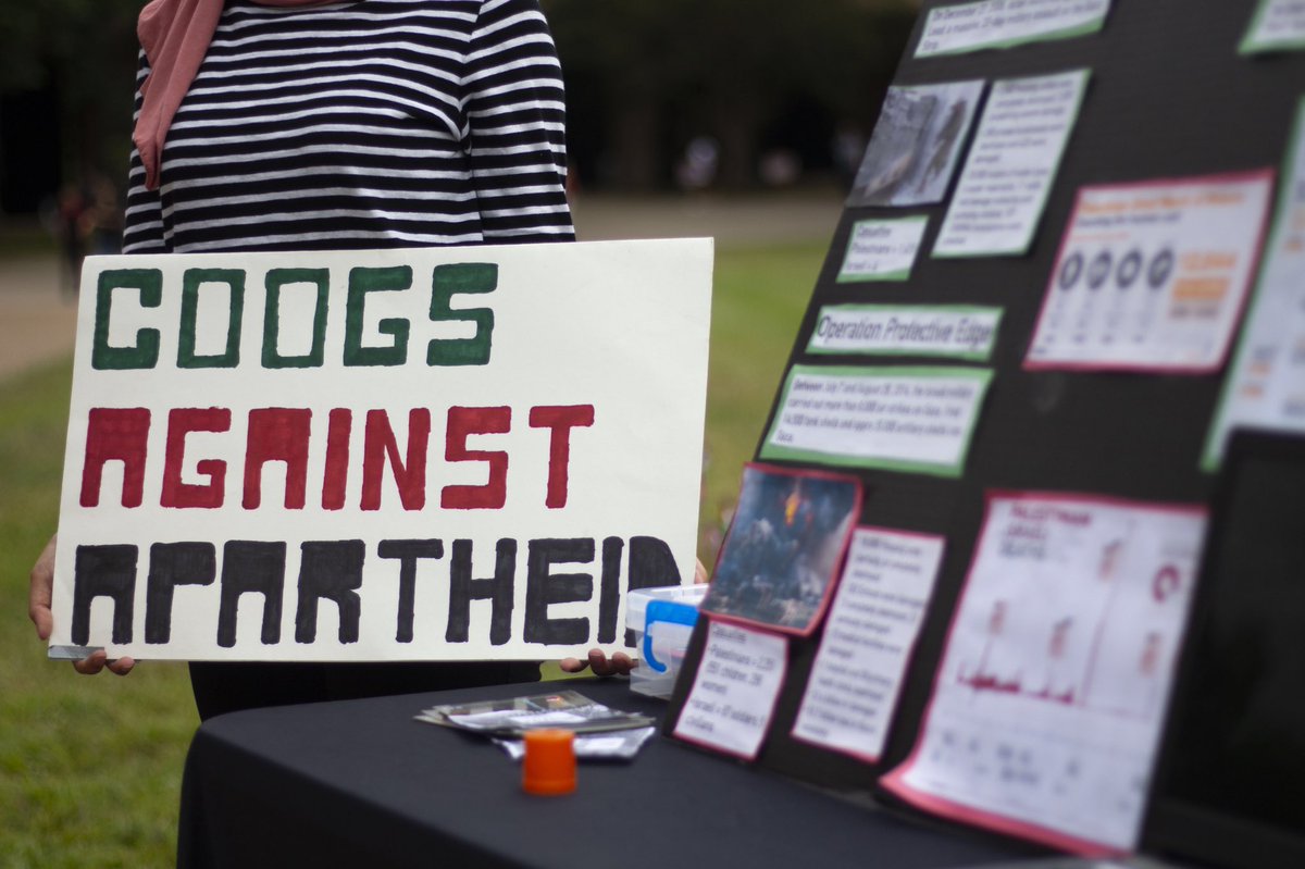 The tweet featured photos of SJP activists tabling with signs that read: “COOGS AGAINST APARTHEID”