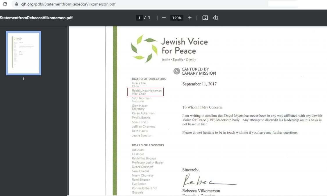 Linda Holtzman spread hatred of Israel and Zionism, endorsed anti-Israel agitators and engaged in anti-Israel activism. She has also demonized a Philadelphia philanthropist and is a supporter of the Boycott, Divestment, Sanctions (BDS) movement.As of March 2022, Holtzman was listed as a member of the JVP Rabbinical Council.