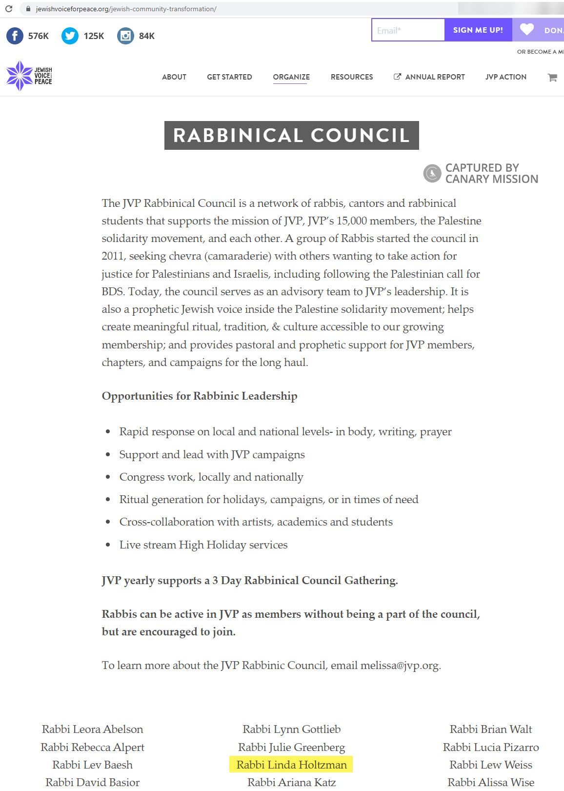 On April 22, 2018, Holtzman was featured in a photo posted to Facebook by JVP with the caption: “Leaders of Jewish spiritual communities in solidarity with Palestine from across the country gathered for Shabbat to work towards a better world at JVP gathering.”