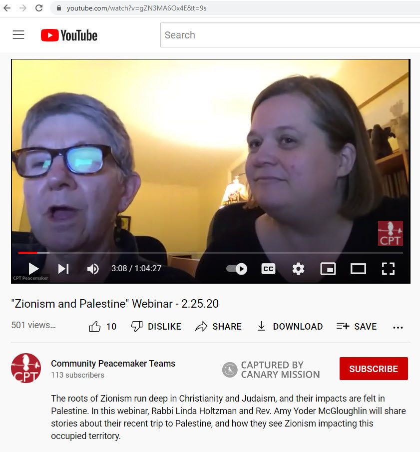 On February 25, 2020, Holtzman participated in a webinar posted to YouTube by Community Peacemaker Teams (CPT) called: “Zionism and Palestine Webinar.”The event description read: “The roots of Zionism run deep in Christianity and Judaism, and their impacts are felt in Palestine. In this webinar, Rabbi Linda Holtzman and Rev. Amy Yoder McGloughlin will share stories about their recent trip to Palestine, and how they see Zionism impacting this occupied territory.”