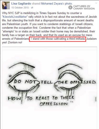 On October 8, 2015, Gagliardo shared photos on Instagram of an event co-hosted by a number of organizations including American Muslims for Palestine (AMP) and NYC SJP.The event urged support for a “Day of Rage” called for by “Palestinian forces.”