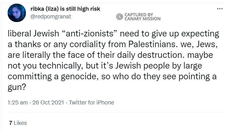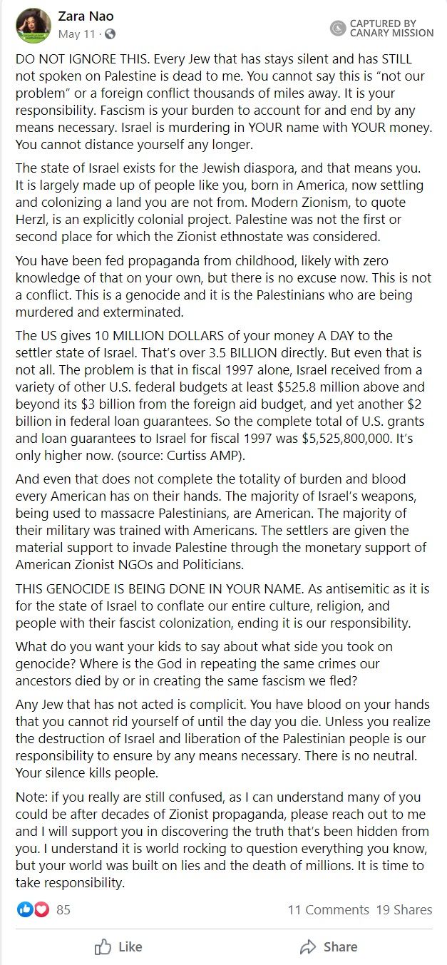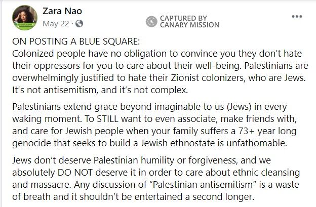As of September 2021, Mamedov-Turchinsky’s Twitter bio stated: “death to israel.”On May 11, 2021, during Israel’s Operation Guardian of the Walls (OGW) in Gaza, Mamedov-Turchinsky posted to Facebook:“Every Jew that has stays silent and has STILL not spoken on Palestine is dead to me... Any Jew that has not acted is complicit. You have blood on your hands that you cannot rid yourself of until the day you die. Unless you realize the destruction of Israel and liberation of the Palestinian people is our responsibility to ensure by any means necessary…”