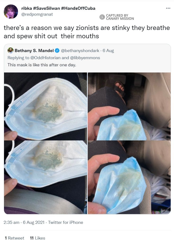 On August 6, 2021, Mamedov-Turchinsky tweeted: “there’s a reason we say zionists are stinky they breathe and spew s**t outtheir mouths.”