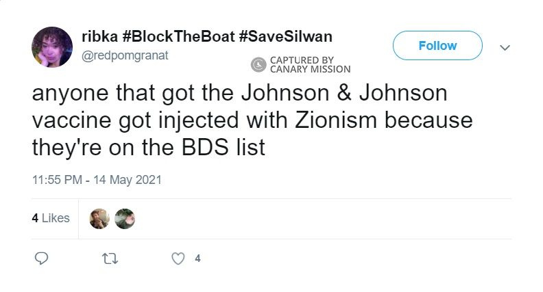 On May 14, 2021, Mamedov-Turchinsky tweeted: “anyone that got the Johnson & Johnson vaccine got injected with Zionism because they're on the BDS list.”