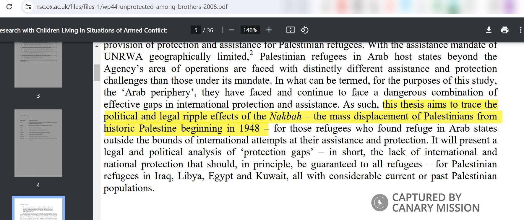 Bitar’s January 2008 master’s thesis, titled: “Unprotected Among Brothers: Palestinians in the Arab World,” aimed [p. 3] to “trace the political and legal ripple effects of the Nakbah...”The term “Nakba” is generally translated as “catastrophe” in Arabic, referring to the outcome of the 1948 Arab-Israeli War. It is a term used to delegitimize the creation of the State of Israel by drawing a comparison to the Holocaust, known in Hebrew as the Shoah, meaning “catastrophe.”