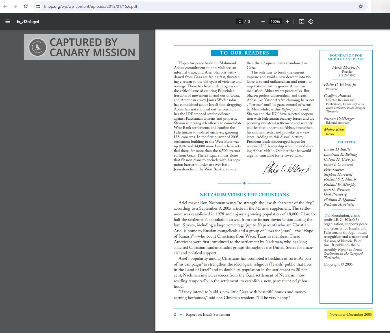 In 2005, Bitar worked [p. 2] as an intern for the anti-Israel organization Foundation for Middle East Peace (FMEP). FMEP has provided grants to multiple anti-Israel groups such as Jewish Voice for Peace (JVP) and IfNotNow (INN).