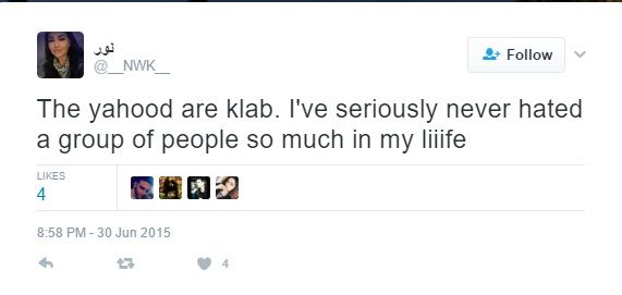 On July 3, 2016, Afna tweeted: "Yel3an el yahood [May Allah curse the Jews]."