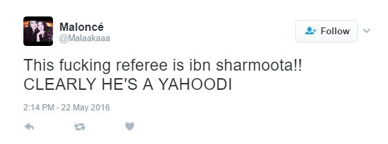 On May 22, 2016, Abdelqader tweeted: "This f**king referee is ibn sharmoota [son of a whore]!! CLEARLY HE'S A YAHOODI [Jew]."