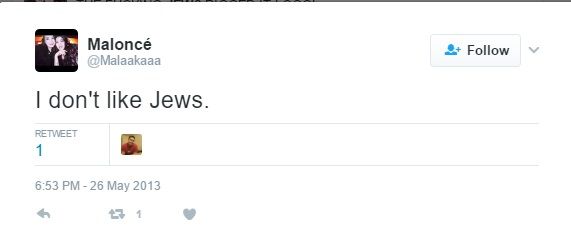 On May 26, 2013, Abdelqader tweeted: βI don't like Jews.β