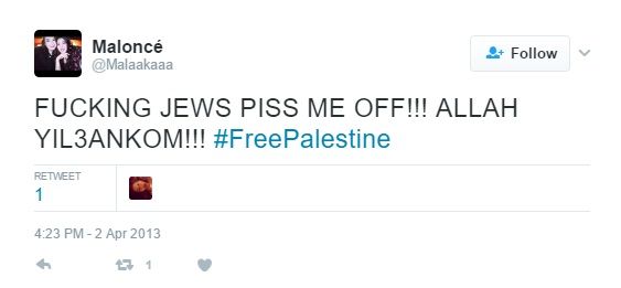 On April 2, 2013, Abdelqader tweeted: "F**KING JEWS PISS ME OFF!!! ALLAH YIL3ANKOM!!! [Allah will curse you] #FreePalestine"