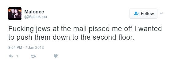 On January 7, 2013, Abdelqader tweeted: "F**king jews at the mall pissed me off I wanted to push them down to the second floor."