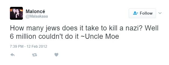 Also on February 12, 2012, Abdelqader tweeted: "How many jews does it take to kill a nazi? Well 6 million couldn't do it ~Uncle Moe."
