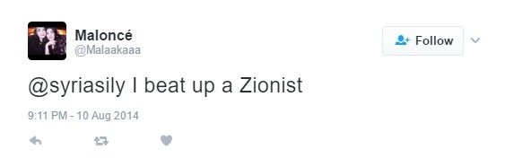 On August 10, 2014, Abdelqader tweeted: "@syriasily I beat up a Zionist."