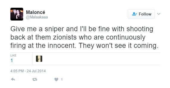 On May 18, 2014, Abdelqader tweeted: "@PaliThunder21 GAS THOSE ZIONISTS LOL."