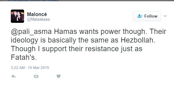 On March 15, 2015, Abdelqader tweeted: "@pali_asma Hamas wants power though. Their ideology is basically the same as Hezbollah. Though I support their resistance just as Fatah's."