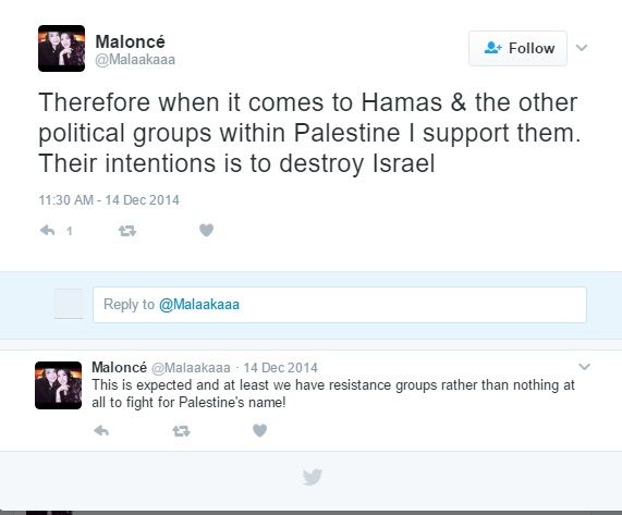 On December 20, 2014, Abdelqader tweeted: "We will get our country back and when we do those zionists will get what they deserve...."