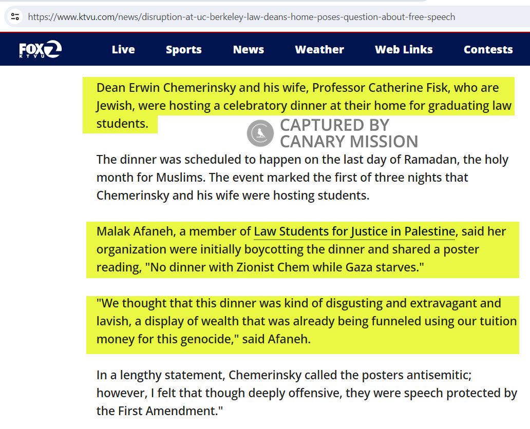 On April 9, 2024, Afaneh reportedly trespassed at and disrupted a private event hosted at the home of UC Berkeley Jewish faculty members. At the event, which was during Israel’s war against Hamas, she promoted hatred of Israel. The incident took place in Oakland, California.The event Afaneh reportedly attended was a celebratory dinner for graduating law students hosted by Berkeley Law dean Erwin Chemerinsky and his wife, Berkeley professor Catherine Fisk.