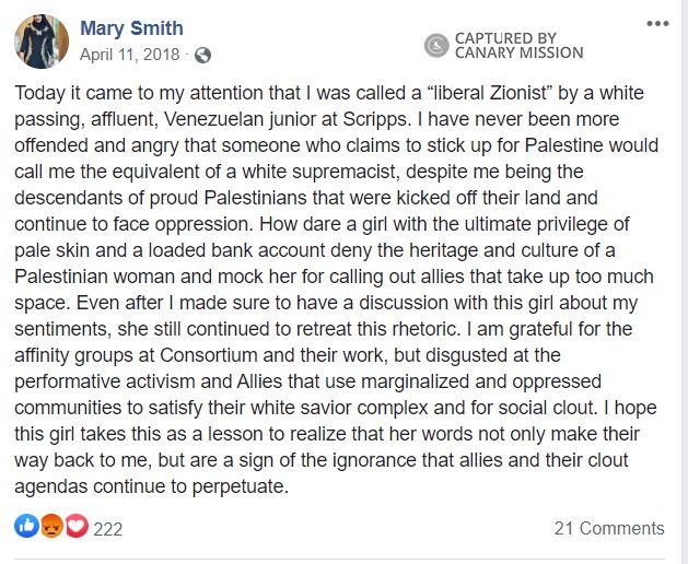 Afaneh’s LinkedIn said she received a bachelor’s degree from Pomona College (Pomona) in Political Science and Government & Middle Eastern Studies in 2021. Pomona is part of the Claremont Colleges (Claremont), a consortium of colleges sharing a campus in Claremont, California. Claremont is also known as the 5Cs or the 7Cs. She was affiliated with Claremont SJP in 2019.