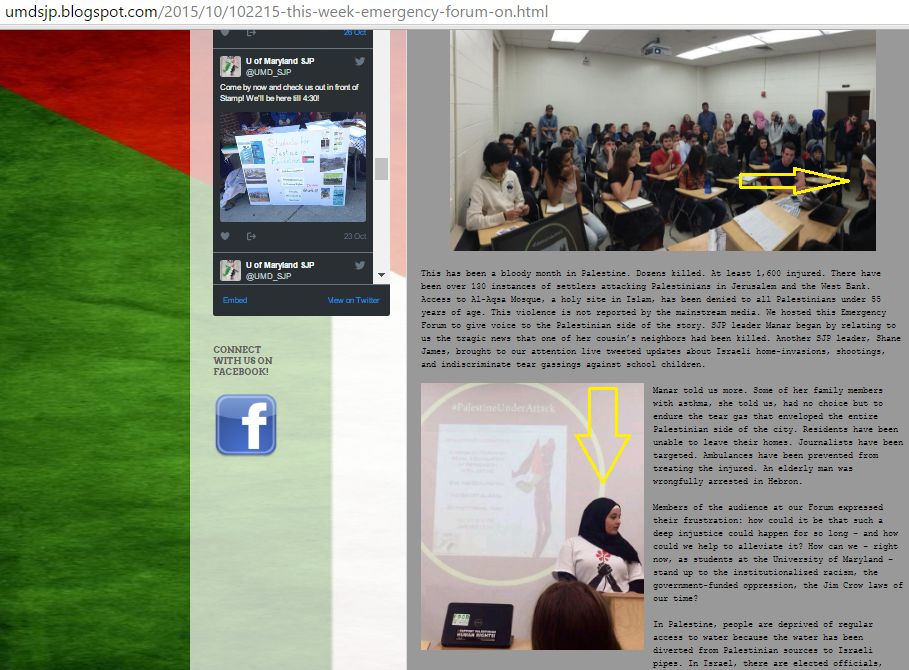 On November 10, 2014, SJP UMD tweeted: “Dozens of students walk out on Israeli ambassador Ron Dermer at UMD: Read more here!”On March 24, 2014, SJP UMD’s blog featured a letter co-signed by other SJP chapters that supported as “political speech” numerous instances of anti-Israel heckling, hate speech and intimidation. SJP UMD referred obliquely to the 11 Muslim Student Union (MSU/MSA) members who were arrested after repeatedly attempting to shout down Michael Oren, the Israeli ambassador to the U.S., when he spoke at the University of California at Irvine in 2010. One of the students slandered Israel by claiming it was engaging in the “genocide” of Palestinian Arabs.
