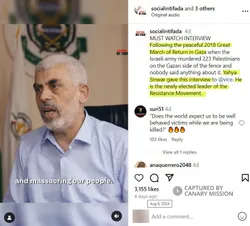 The post that Shouman shared said: “...Following the peaceful 2018 Great March of Return in Gaza…Yahya Sinwar gave this interview…He is the newly elected leader of the Resistance Movement.”