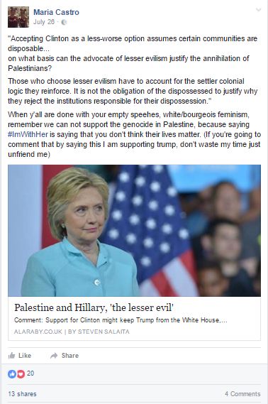 On May 21, 2016, Castro posted on Instagram: "Homesick for Palestine, lost in thought, grounded in resistance…" She made the same comment on Twitter that day.