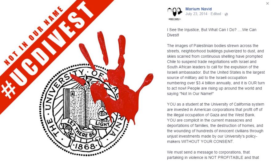 In 2015, while serving as an ASUC senator, Navid authored a BDS resolution titled: “A Resolution in Support of Divestment from Corporations Violating Palestinian Human Rights.”Navid co-authored a February 6, 2015 article in UC Berkeley’s student newspaper, The Daily Californian, promoting BDS. The article urged UC student representatives to pressure the UC governing board to implement the resolution which sought “to divest from companies involved in Israel’s occupation.”