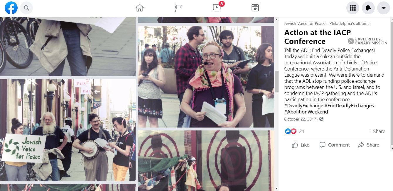 On October 22, 2017, JVP Philly held a protest against the ADL outside the International Association of Chiefs of Police Conference (IACP), where the ADL was a participant. JVP Philly posted to Facebook that the protest was staged in order “to demand that the ADL stop funding police exchange programs between the U.S. and Israel...”