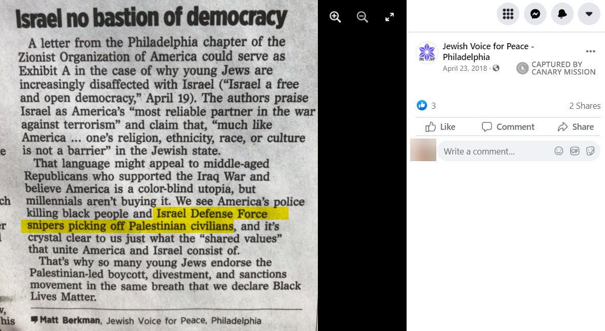 On April 23, 2018, in a letter to the editor published in the Philadelphia Inquirer and posted by JVP Philly to Facebook, Berkman wrote: “We see America’s police killing black people and Israel Defense Force snipers picking off Palestinian civilians, and it’s crystal clear to us just what the ‘shared values’ that unite America and Israel consist of.”