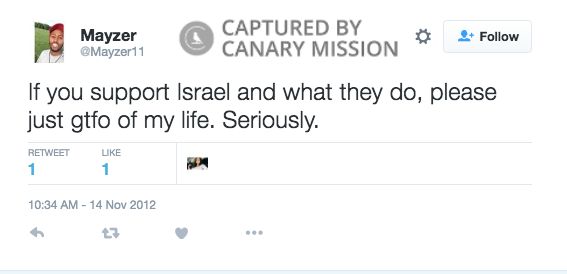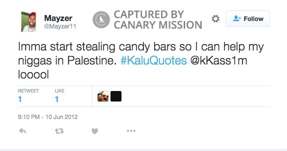 Mayzer Muhammad was at the center of a scandal regarding anti-Semitic tweets of his that were exposed while he was the president of the Undergraduate Student Government at the University of St. Thomas (St. Thomas), in 2017.He has also promoted incitement and hatred of Israel, both online and at anti-Israel demonstrations.