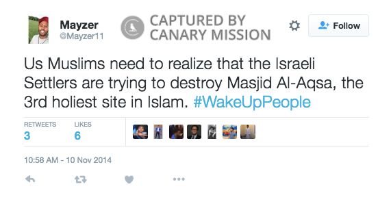 On November 10, 2014, Muhammad tweeted: “Us Muslims need to realize that the Israeli Settlers are trying to destroy Masjid Al-Aqsa, the 3rd holiest site in Islam. #WakeUpPeople.”
