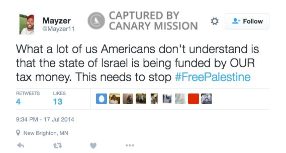 On July 17, 2014, Muhammad tweeted: “What a lot of us Americans don't understand is that the state of Israel is being funded by OUR tax money. This needs to stop #FreePalestine.”