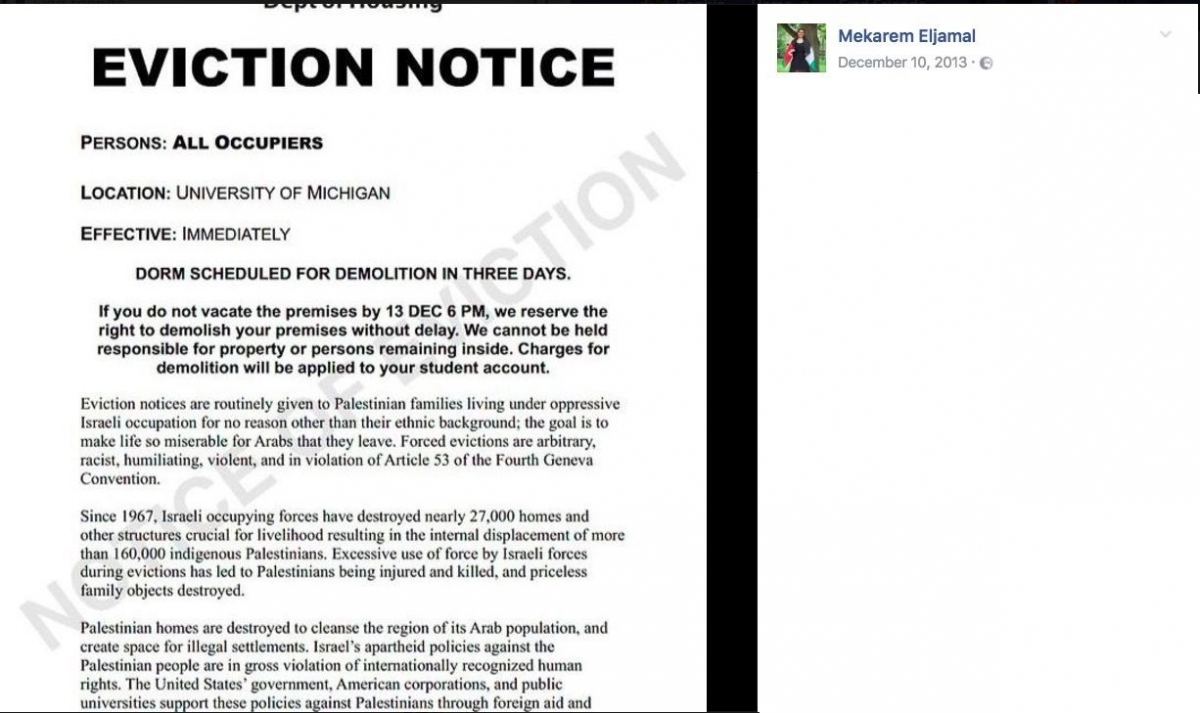 On December 10, 2013, Eljamal and other SAFE members posted mock eviction notices, in violation of campus policy, on the dorm rooms of approximately 1,500 students*, *"in order to have students momentarily experience the feeling of receiving an eviction notice upon waking up."